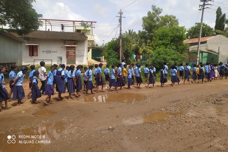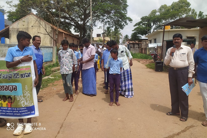 The day began with a vibrant rally and awareness march inaugurated by Mr. P.T. Rudresh, President of the School Development and Monitoring Committee (SDMC), GHPS, Huchangipura. The rally featuring powerful slogans and display of placards, passed through the main streets of Huchangipura to raise awareness on the issue of child labour. Snacks and juice distributed to all at the end of the rally.